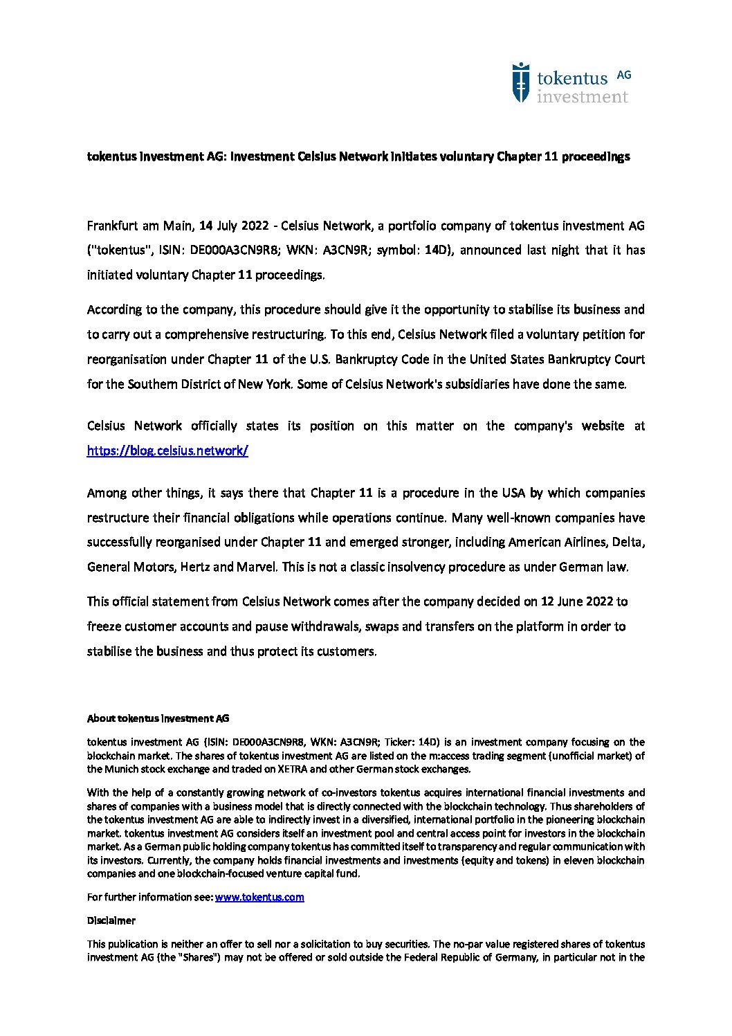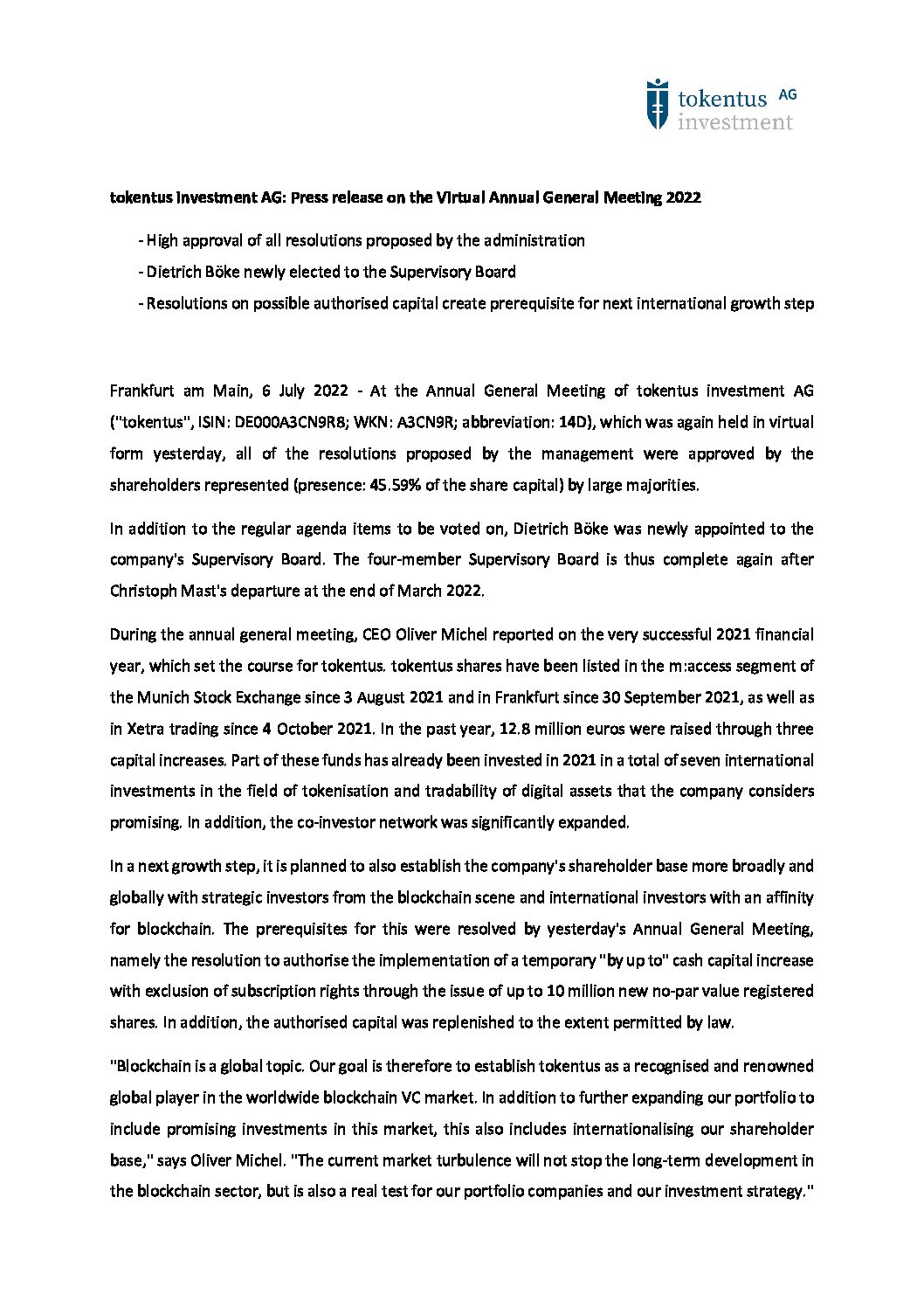 tokentus investment AG will be presenting at the Equity Forum Fall Conference on Monday the 5th of September 2022 in Frankfurt am Main